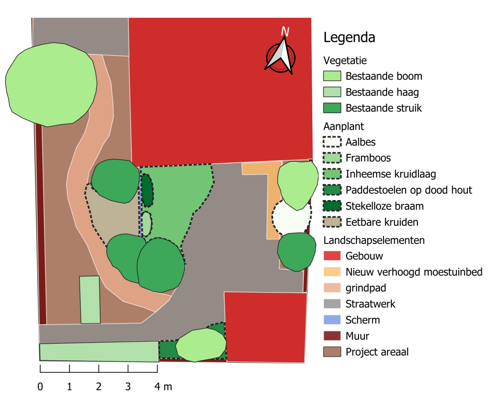 Het eindresultaat laat zien dat er ook in een kleine stadstuin ruimte is voor eetbare elementen en een samenwerkend ecosysteem, naast de standaard functies voor opslag, recreatie en looppaden.