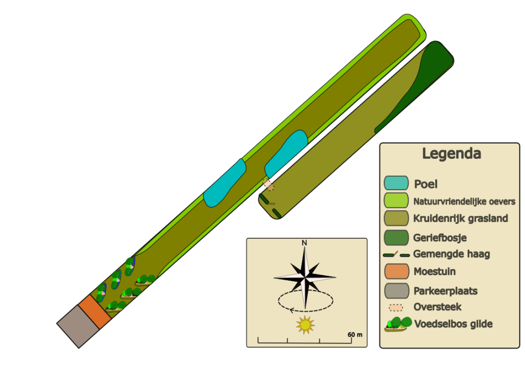 Dit heeft geleid tot een ontwerp waarin natuurtype vochtig hooiland wordt ontwikkeld richting de achterzijde van het perceel. Op dit rustige deel van het perceel wordt door de aanleg van natuurvriendelijke oevers en ondiepe poelen, in combinatie met verschraling doormiddel van maai en afvoer beheer een voor weidevogels aantrekkelijk habitat gecreëerd.
